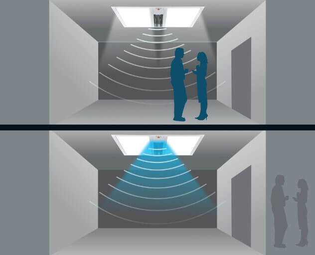 Dzięki wbudowanemu detektorowi ruchu lampa UV-C zapewnia bezpieczne działanie i automatycznie wyłącza się, gdy w pomieszczeniu przebywają ludzie lub zwierzęta.