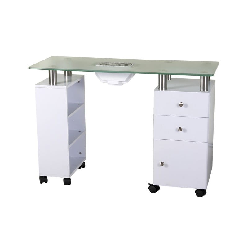 Jest to mebel nie tylko funkcjonalny, ale jednocześnie niezwykle elegancki, idealnie komponujący się z wyposażeniem nowocześnie urządzonych pomieszczeń. Oprócz trzech otwartych półek, posiada szafkę i dwie pojemne szuflady, oraz pochłaniacz pyłu. Dzięki aż ośmiu kółkom mebel jest stabilny oraz łatwo go przestawiać w pomieszczeniach, nawet jeśli jest obciążony. Kilkunastocentymetrowe podwyższenie pod blatem z grubego, hartowanego szkła czyni z proponowanego stolika idealny do wykonywania zabiegów manicure.