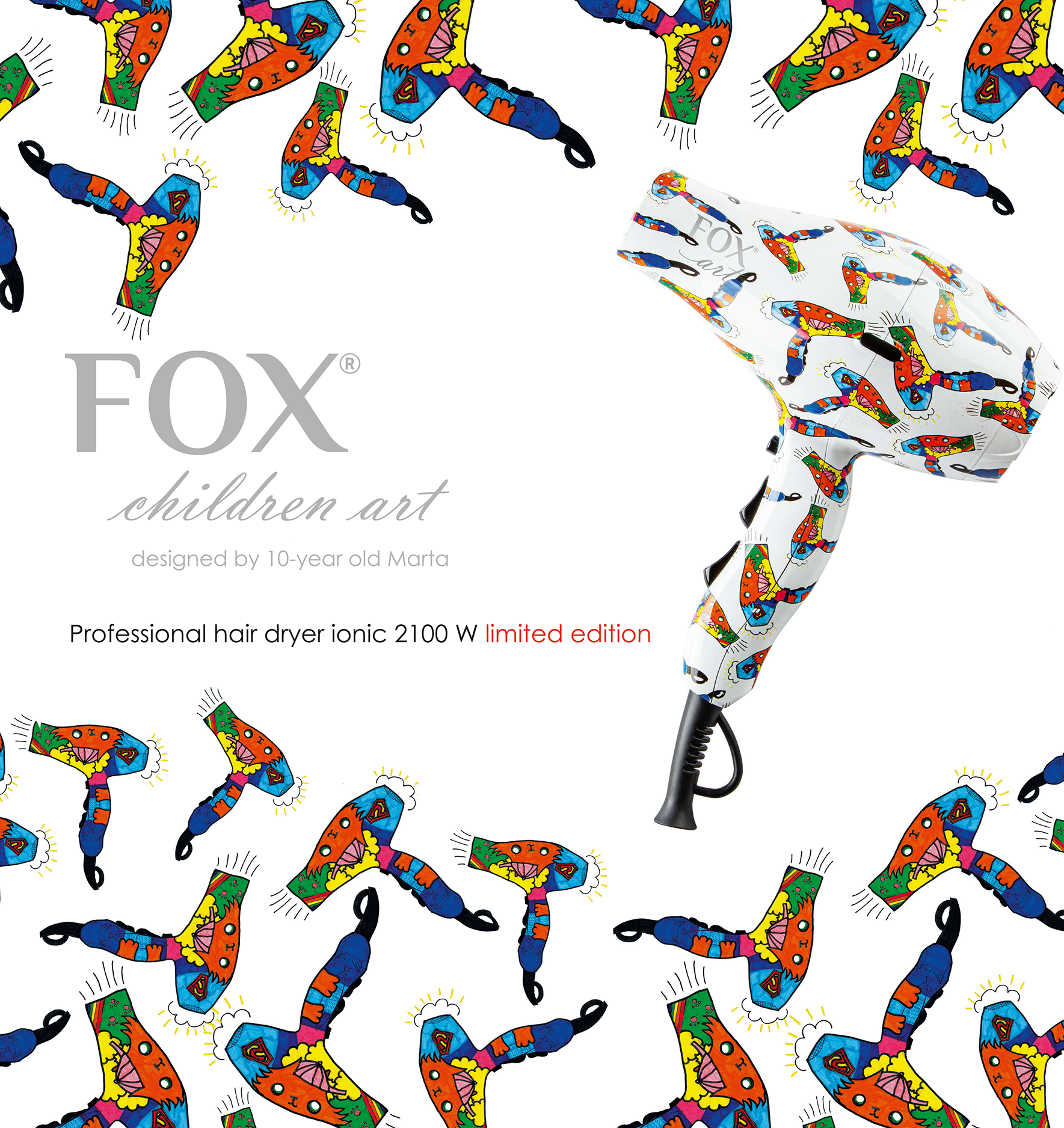 FOX Children Art to seria profesjonalnych suszarek do włosów których wzory zostały zaprojektowane przez dzieci dla fryzjerów.