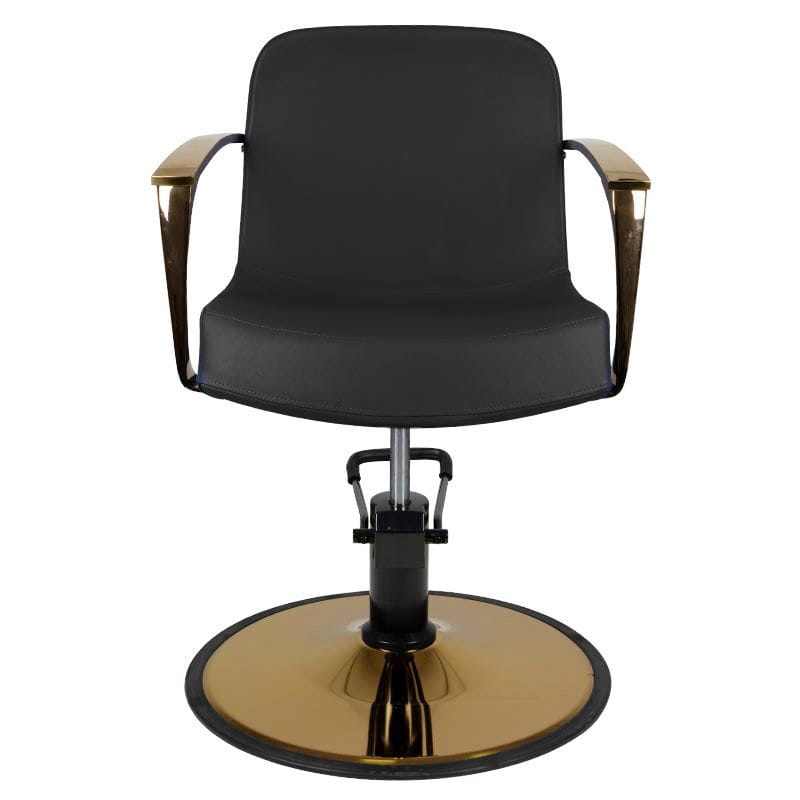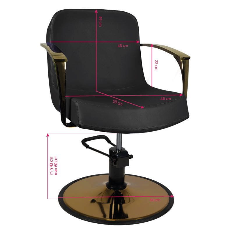 Nowoczesny fotel fryzjerski o wyjątkowym designie i niezwykłej jakości. Metalowe elementy błyszczą kolorem miedzi wzmagając poczucie luksusu. Bardzo wygodny, idealnie pasujący do nowoczesnych salonów. Specjalnie wyprofilowany, by zapewnić klientowi wygodną pozycję podczas zabiegu. Regulowany w płaszczyźnie pionowej. Bardzo stabilny i solidny. Obicie z wysokiej jakości eko skóry. Kolor czarny.