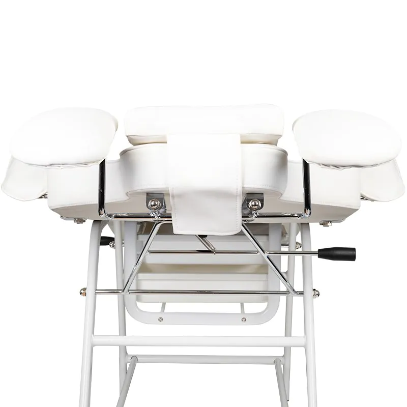 Fotel posiada ręczną regulację podnóżka, oparcia oraz podparcia rąk dla osoby wykonującej zabieg. Zastosowane podparcie rąk jest niezwykle praktycznym rozwiązaniem nie spotykanym w innych fotelach. Wyposażony w wygodną poduszkę dla klienta oraz podręczne kuwety na umieszczenie niezbędnych akcesoriów.