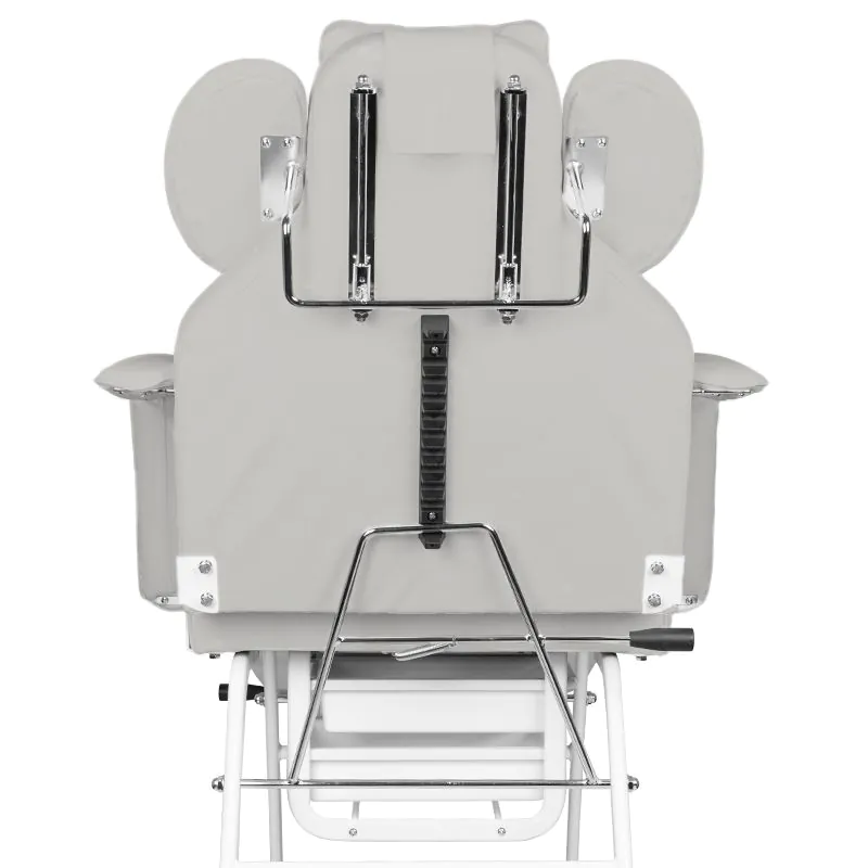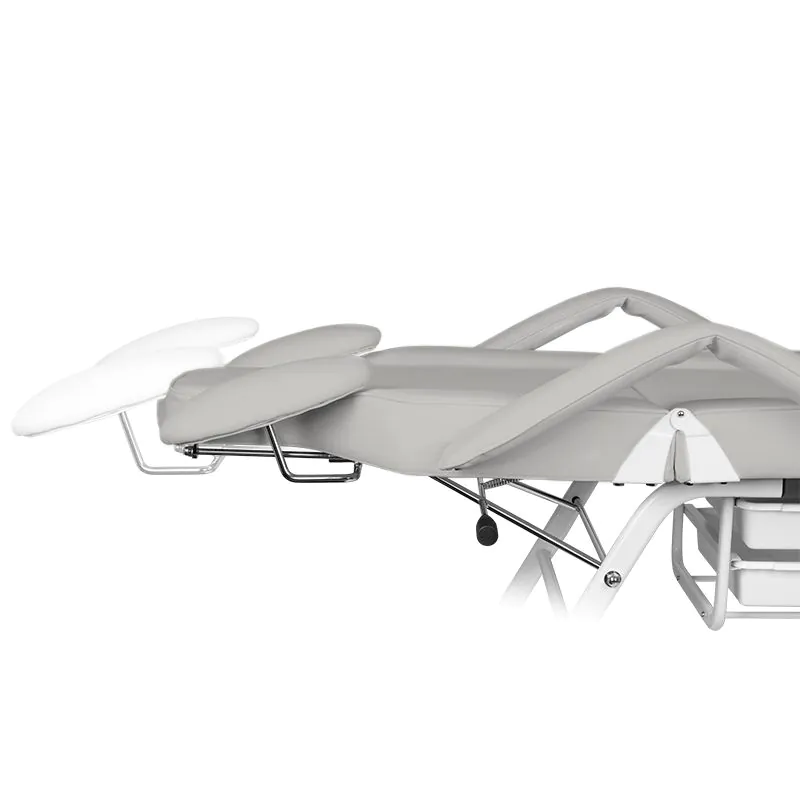 Fotel posiada ręczną regulację podnóżka, oparcia oraz podparcia rąk dla osoby wykonującej zabieg. Zastosowane podparcie rąk jest niezwykle praktycznym rozwiązaniem nie spotykanym w innych fotelach. Wyposażony w wygodną poduszkę dla klienta oraz podręczne kuwety na umieszczenie niezbędnych akcesoriów.