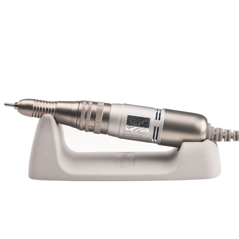 Frezarkę tę możemy obsługiwać zarówno ręcznie, jak i nogą dzięki dołączonemu napędowi nożnemu. Bardzo dobrej jakości głowica wyróżnia się momentem obrotowym 2,9 Ncm oraz prędkością w zakresie od 0 do 30 tysięcy obrotów. Do zestawu dołączony został uchwyt na głowicę, dzięki któremu możemy w każdej chwili odłożyć ją podczas zabiegu w bezpieczne i stabilne miejsce.