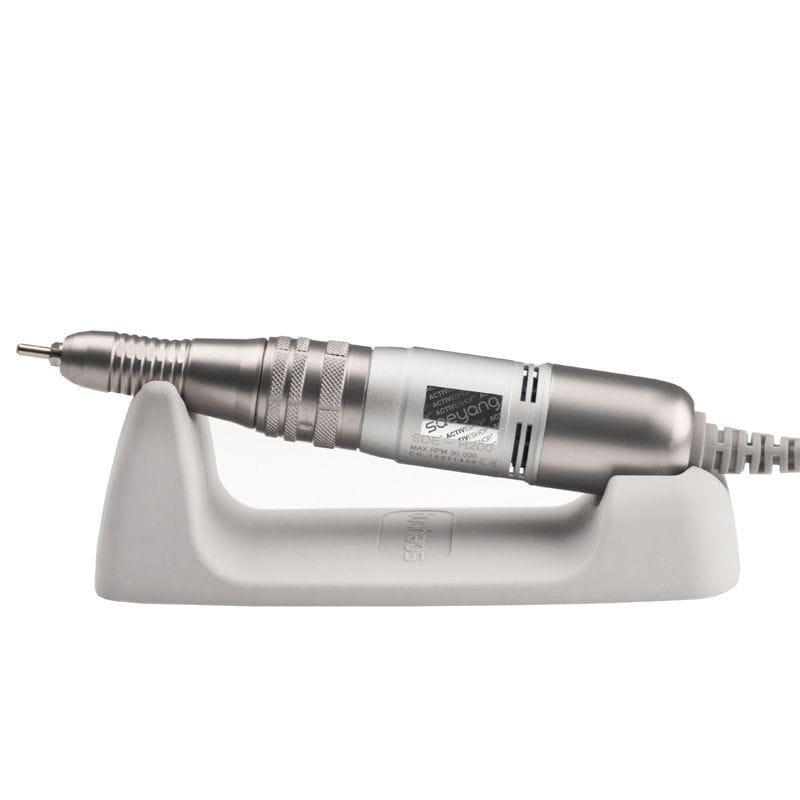 Frezarkę tę możemy obsługiwać zarówno ręcznie, jak i nogą dzięki dołączonemu napędowi nożnemu. Moment obrotowy 2,9Ncm pozwala na płynną regulację ruchów w zakresie od 0 do 30 tysięcy obrotów. Do zestawu dołączony został uchwyt na głowicę, dzięki któremu możemy w każdej chwili odłożyć ją podczas zabiegu w bezpieczne i stabilne miejsce.