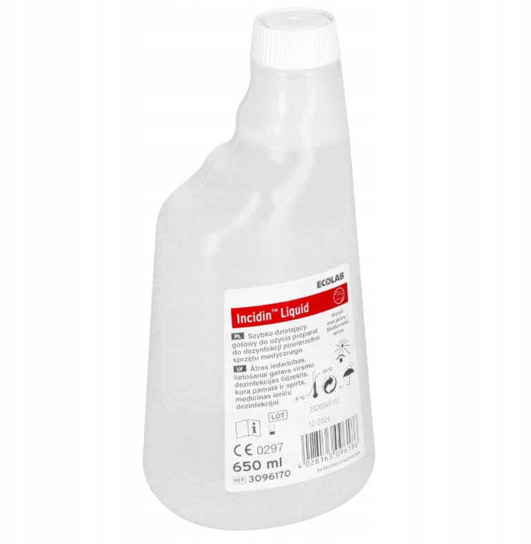 Incidin Liquid to szybko działający, alkoholowy preparat dezynfekcyjny przeznaczony do profesjonalnej dezynfekcji powierzchni i wyposażenia medycznego. Produkt nie zawiera aldehydów, szybko wysycha bez pozostawiania smug i charakteryzuje się przyjemnym zapachem.
