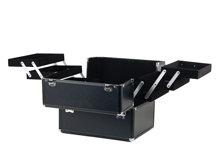 Wysokiej jakości, profesjonalny, wytrzymały kuferek kosmetyczny do transportu lub przechowywania kosmetyków, lampy UV, frezarki. Kuferek jest rozkładany. W środku znajduje się 6 rozkładanych półek, każda o wymiarach: 13,5 cm x 22,5 cm.