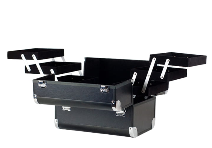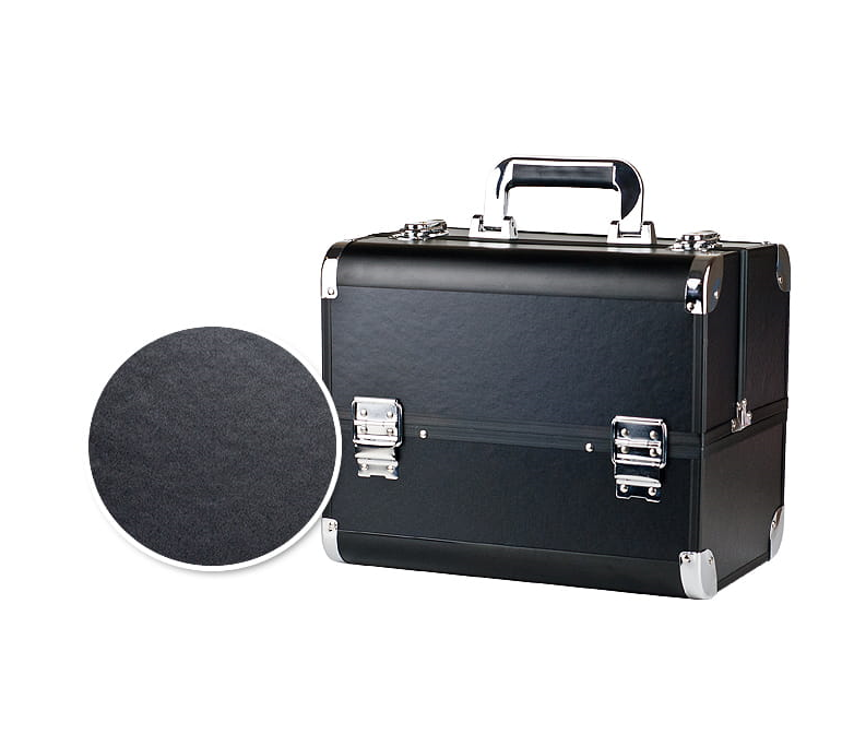 Wysokiej jakości, profesjonalny, wytrzymały kuferek kosmetyczny do transportu lub przechowywania kosmetyków, lampy UV, frezarki. Kuferek jest rozkładany. W środku znajduje się 6 rozkładanych półek, każda o wymiarach: 13,5 cm x 22,5 cm.