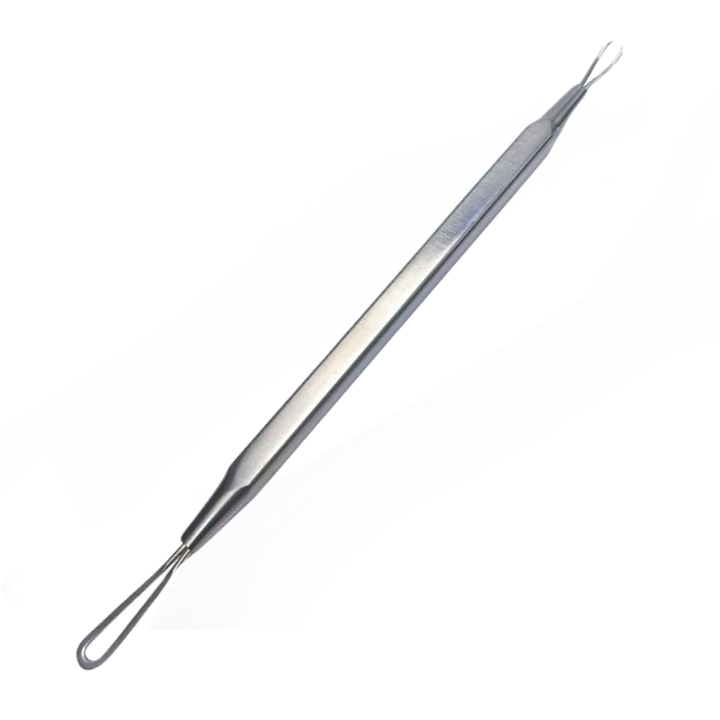 Łyżeczka wykonana jest ze stali nierdzewnej, dzięki czemu można ją dezynfekować. Jest całkowicie bezpieczna i nie powoduje stanów zapalanych skóry, jak w przypadku ręcznego wyciskania zaskórników. Dwustronna. Bardzo prosta w użyciu.