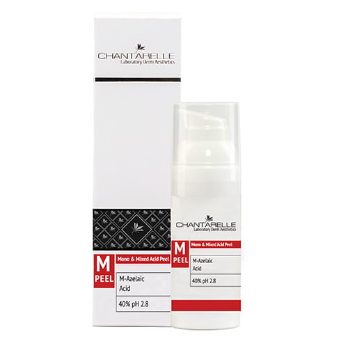 M-kwas azelainowy 40% pH 2,8 - preparat do zabiegu eksfoliacji, hamuje wydzielanie sebum, odblokowuje ujścia gruczołów łojowych, reguluje proces rogowacenia, działa antyoksydacyjnie, bakteriostatycznie i przeciwzapalnie oraz rozjaśnia przebarwienia.