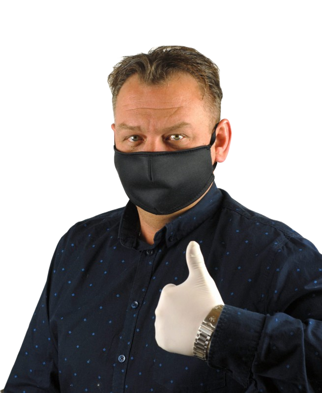 Jednorazowa maseczka ochronna na twarz. Wnętrze maski uszyte z białego materiału.