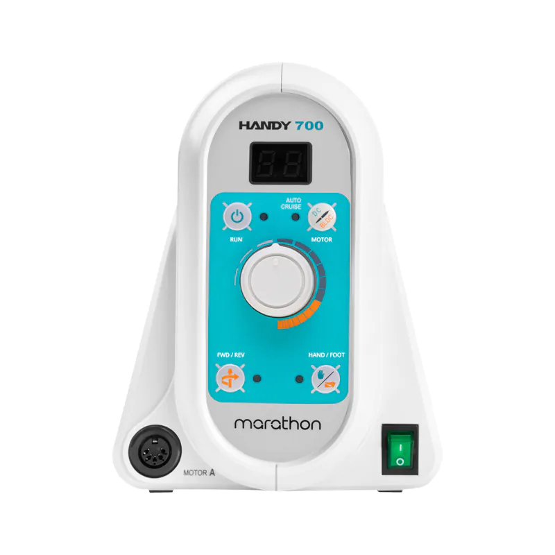 Frezarka protetyczna Handy 700 oferuje dużą moc 100W oraz cichą pracę. Zapewnia dużą prędkość do 50 tysięcy obrotów na minutę. Praca z tą frezarką jest wyjątkowo komfortowa dzięki temu, iż w mikrosilniku głowicy został zastosowany system redukcji hałasu, umniejszonego o 20% w porównaniu do konwencjonalnych modeli. Budowa bazy jest ergonomiczna, posiada praktyczny uchwyt do przenoszenia oraz pojemnik na głowicę.