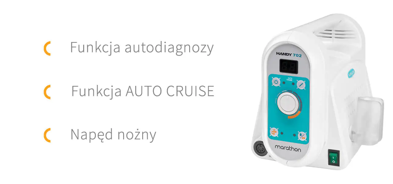 Profesjonalna, precyzyjna frezarka protetyczna o dużej mocy, bezwibracyjna i bardzo cicha podczas pracy. Frezarka charakteryzuje się dużą wytrzymałością i niezawodnością pracy, posiada ergonomiczną budowę bazy i pióra, dzięki swej budowie może być używana jako frezarka stacjonarna, a także przenośna. Sterowana z bazy jak i napędem nożnym z płynną regulacją. Frezarka posiada funkcję AUTO CRUISE, tzn. możliwość ustawienia stałej żądanej prędkości, jak też funkcję autodiagnozy, dzięki której nadzoruje prawidłowe działanie lokalizując wadliwy obszar poprzez wyświetlanie odpowiedniego kodu błędu.