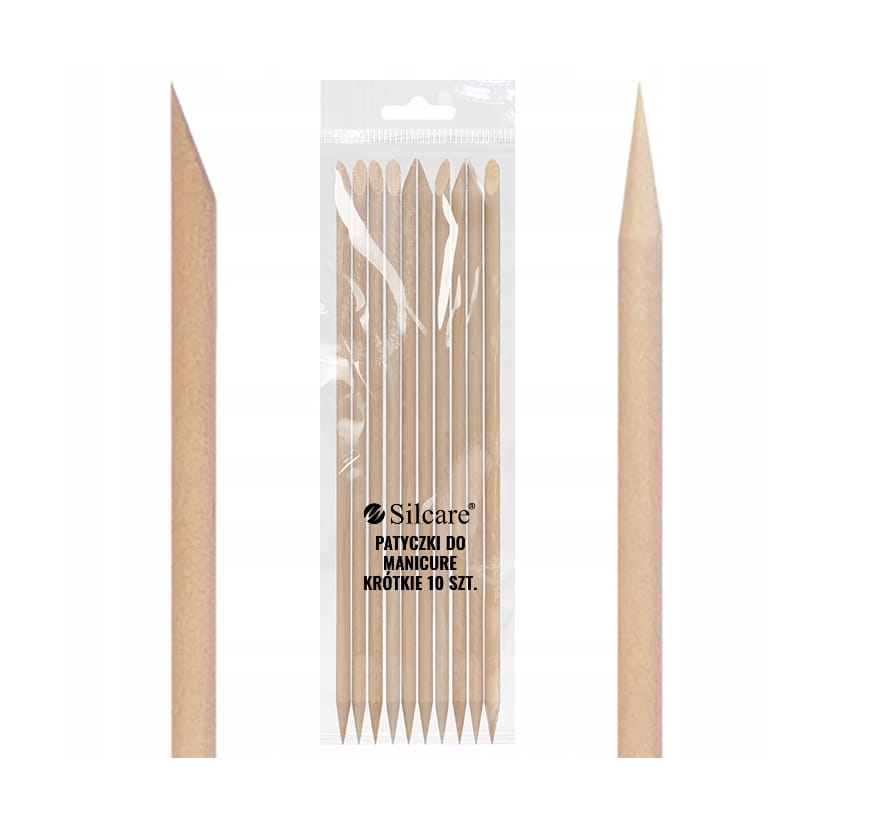 Profesjonalne patyczki do manicure Silcare przeznaczone do precyzyjnej pielęgnacji paznokci. Krótka forma zapewnia wygodny chwyt i pełną kontrolę, dzięki czemu produkt idealnie sprawdzi się zarówno w salonach kosmetycznych, jak i w domowym manicure.