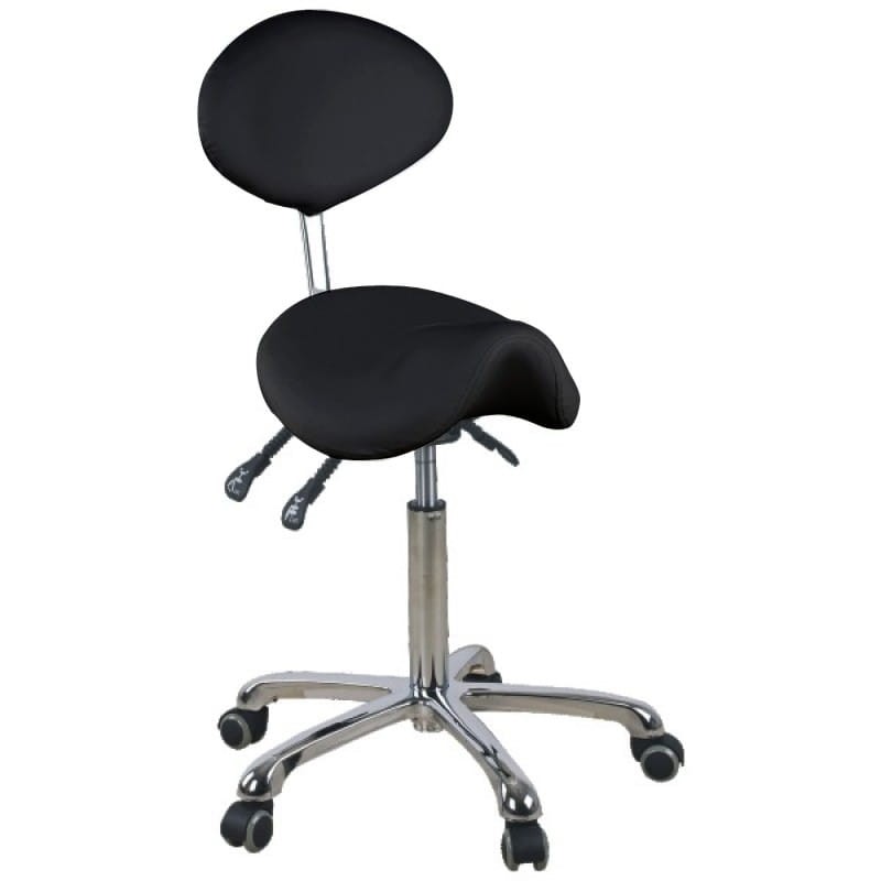 Wygodny, ekskluzywny , stabilny taboret kosmetyczny z oparciem oraz profilowanym siedziskiem, na pięcioramiennej bardzo stabilnej podstawie podstawie.