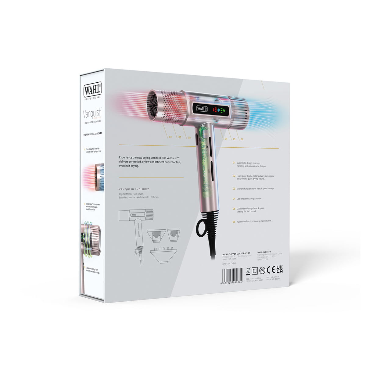Poznaj nowy standard suszenia włosów. Suszarka WAHL Vanquish jest bardzo lekka i wydajna. Zapewnia kontrolowany przepływ powietrza dla równomiernego oraz szybkiego suszenia
